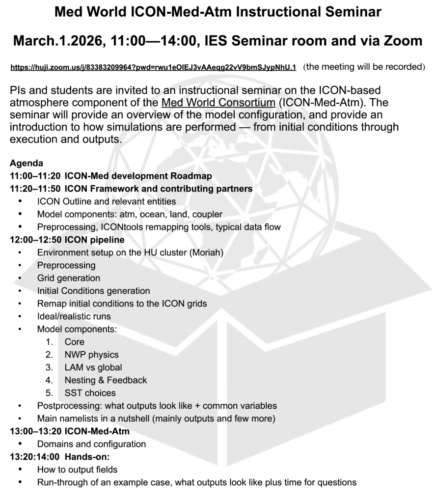 This meeting will serve as the starting point for collaboratively defining the scientific priorities, observational strategies, and logistical framework for the planned full-field campaign in Israel. We warmly encourage participation from researchers, students, stakeholders, and industry partners interested in atmospheric observations, climate dynamics, environmental monitoring, and related fields. Your input at this early stage is crucial for shaping the scientific and societal outcomes of the campaign.